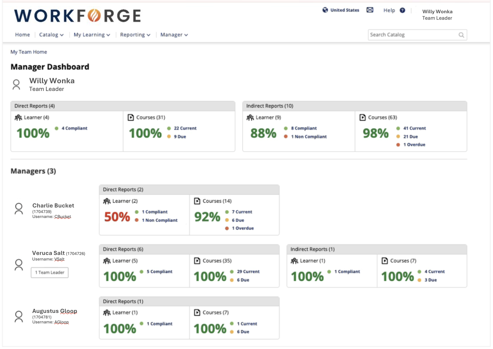 This is a vital tool for managers to gain visual insight into the compliance status of their direct and indirect reports.