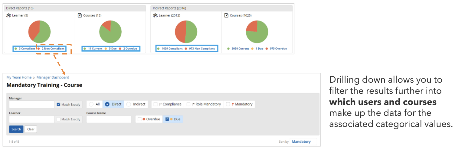 1. Identify employees lacking critical safety training.- Look at the Non-Compliant or Overdue status in either the Direct Reports or Indirect Reports. Use the drill-through functionality to display username and/or course details. Reassign required courses to lacking users.